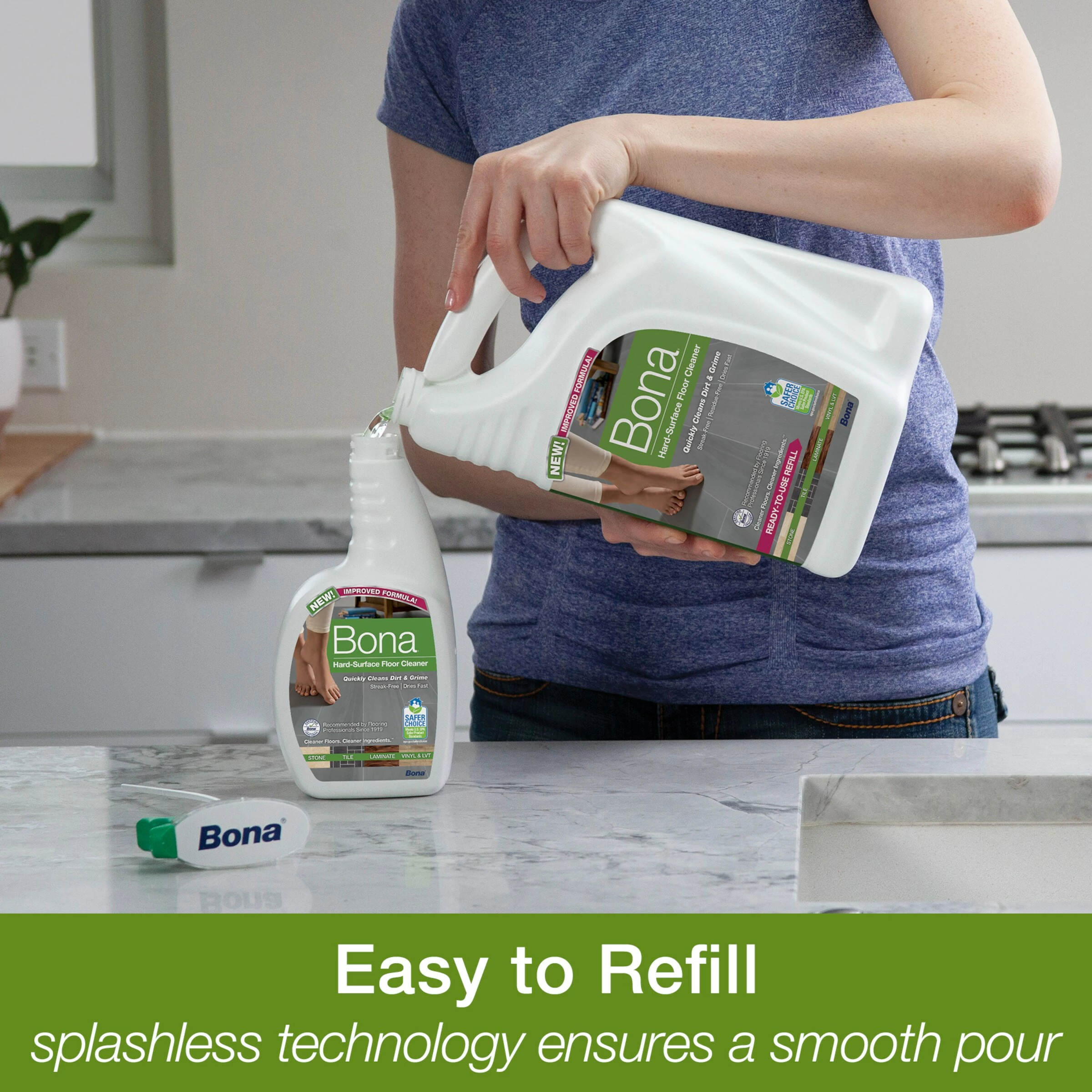 Bona® Hard-Surface Floor Cleaner Refill fills your empty Bona cartridge or spray bottle with ready-to-use Bona Hard-Surface Floor Cleaner. The bottle has splashless technology while the wide handle allows for an easy, controllable refill experience. The rinse-free, streak-free formula cleans hard-surface floors effectively by removing dust, dirt and grime leaving your floors clean and beautiful.