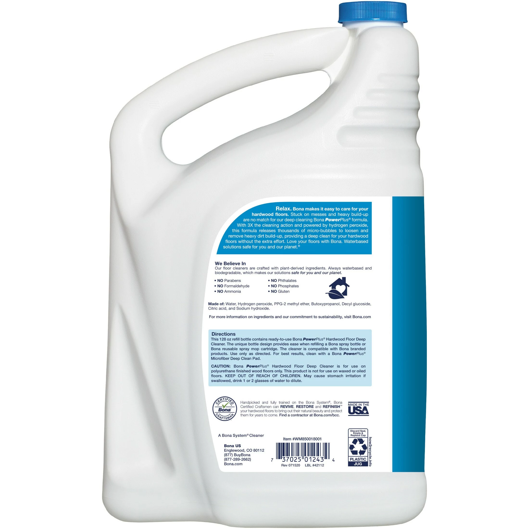 Bona PowerPlus® Hardwood Floor Cleaner Refill fills your empty Bona cartridge or spray bottle with ready-to-use Bona PowerPlus® Hardwood Floor Cleaner. The bottle has splashless technology, and the handle and side grip allow for an easy, controllable refill experience. Bona PowerPlus® Hardwood Floor Deep Cleaner has an oxygenated formula that loosens and removes heavy dirt build-up, providing a deep clean for your hardwood floors without the extra effort. Use Bona PowerPlus® Hardwood Floor Deep Cleaner with Bona PowerPlus® Microfiber Deep Clean Pad for the ultimate cleaning performance.