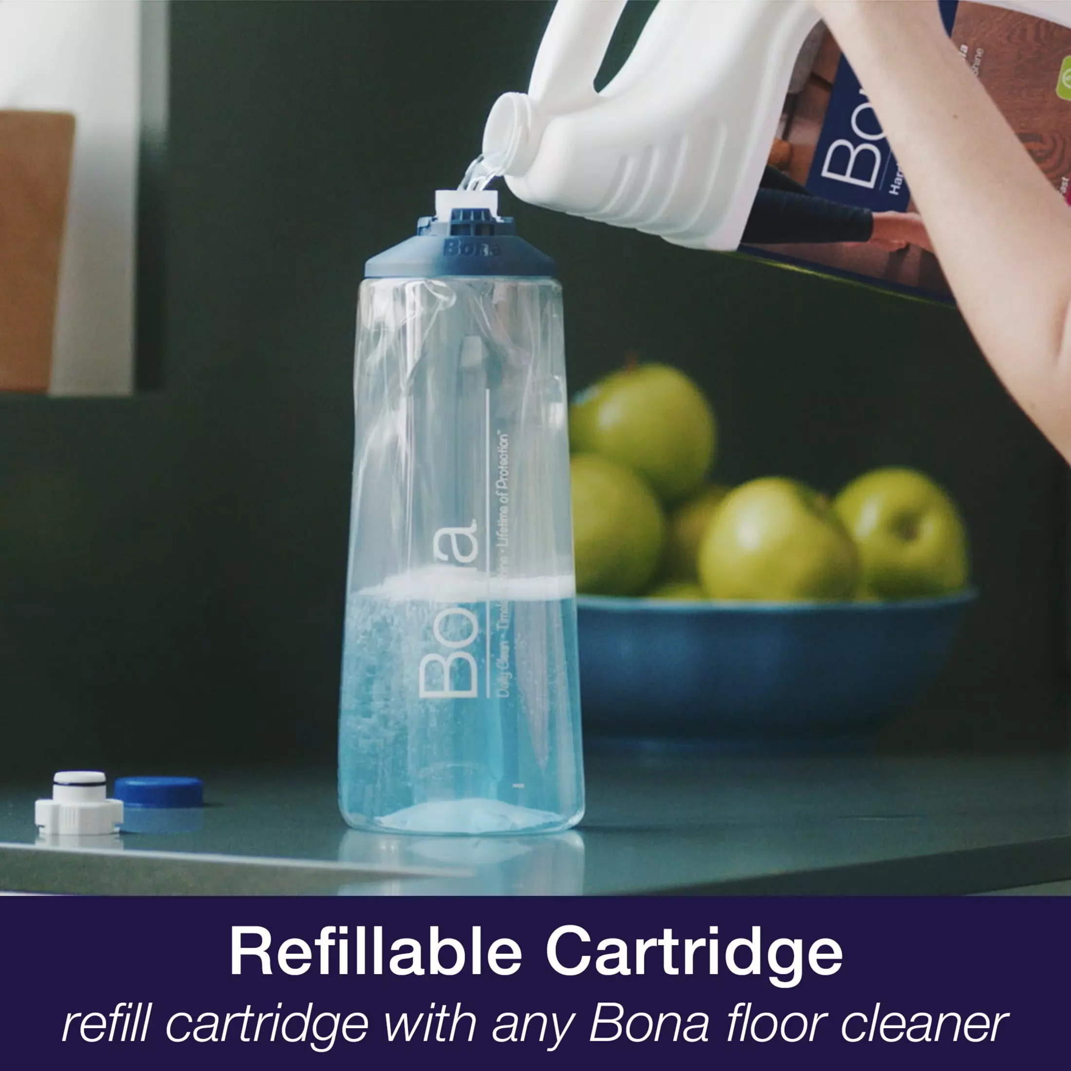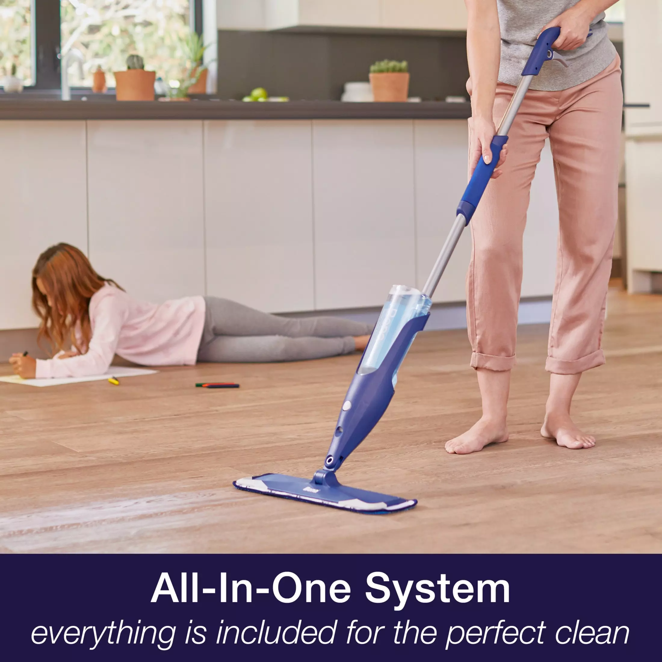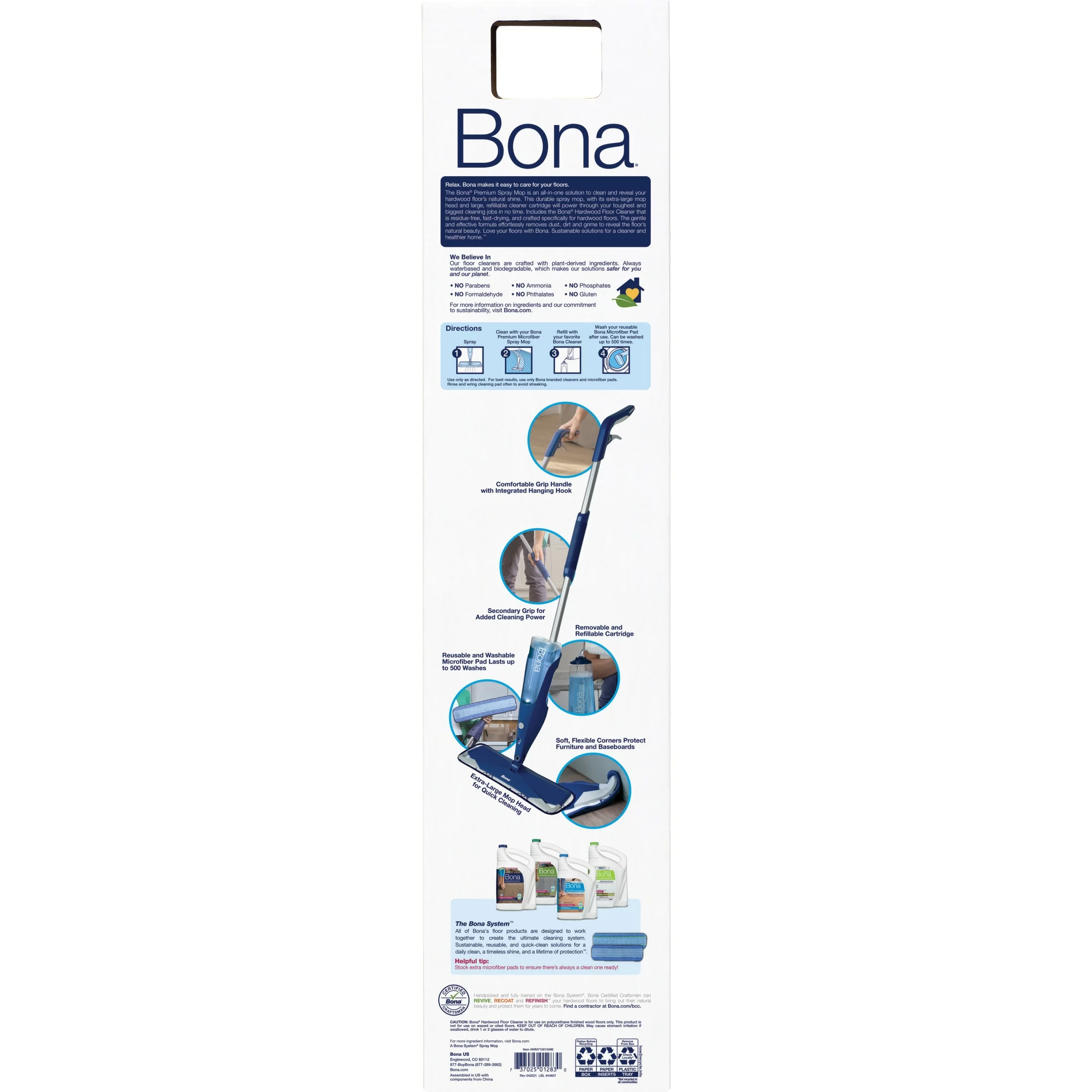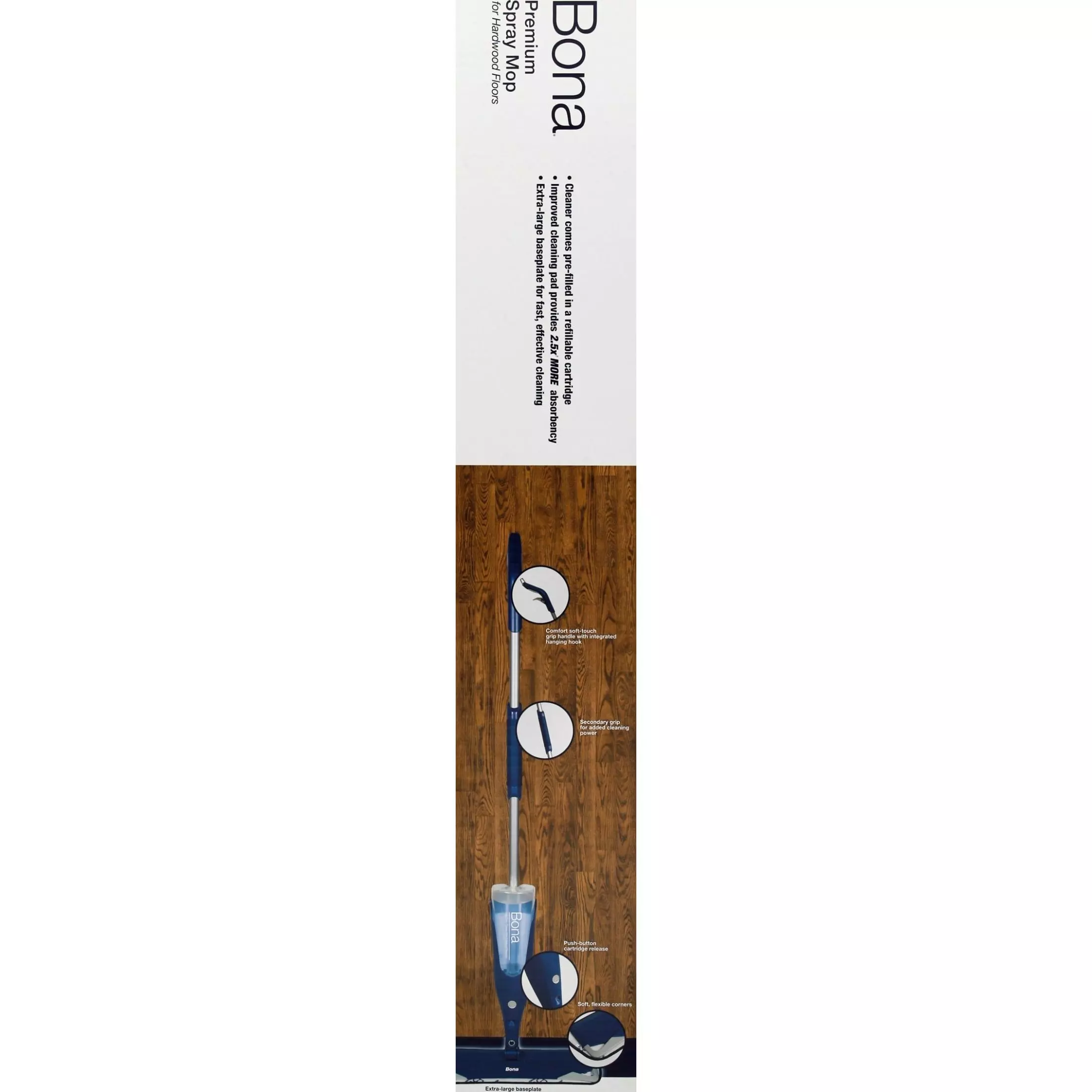 The next-generation Bona® Premium Spray Mop for Hardwood Floors is an all-in-one solution to clean and reveal the natural shine of your floors. Includes Bona’s waterbased residue-free cleaner in a refillable cartridge and a washable microfiber pad. Cleans hardwood floors effectively by removing dust, dirt and grime revealing beautiful floors. The extra-large mop head delivers quick and effective cleaning, and the flexible rubber corners protect baseboards and furniture from dings and scratches. A secondary grip allows for added cleaning power, and a retractable hook makes storage easy.