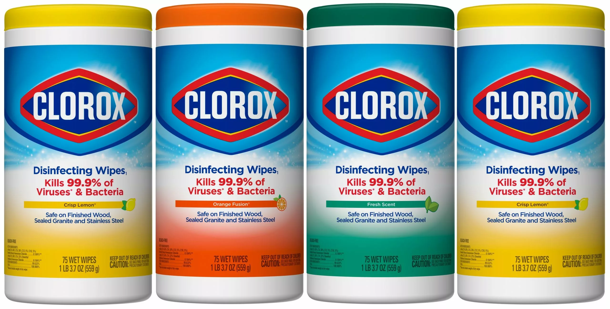 - DISPOSABLE WIPES: This four-pack of 75-count canisters that easily dispenses disposable antibacterial wipes that come in three fresh clean scents. Dispose of wipes according to manufacturer instructions