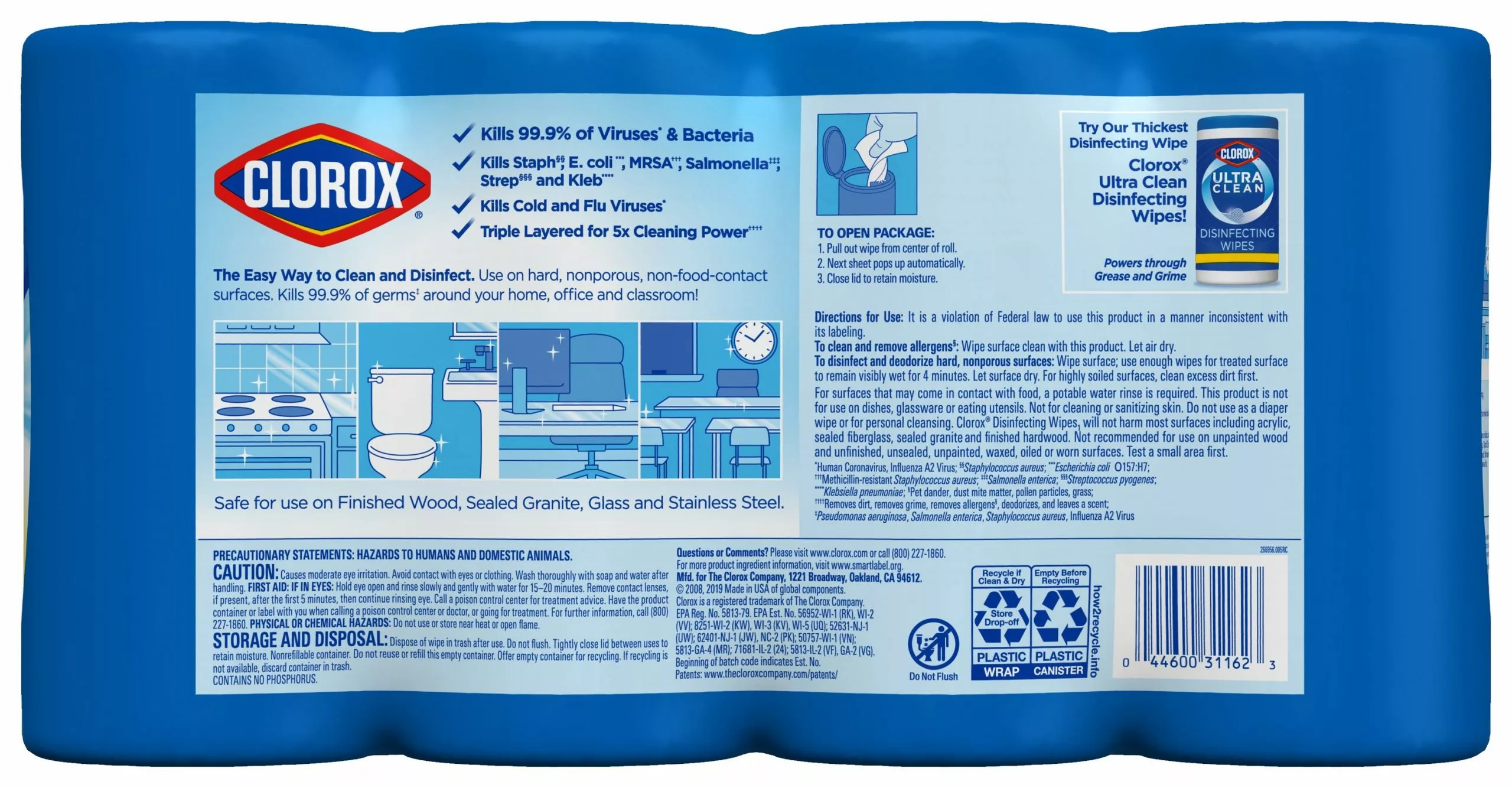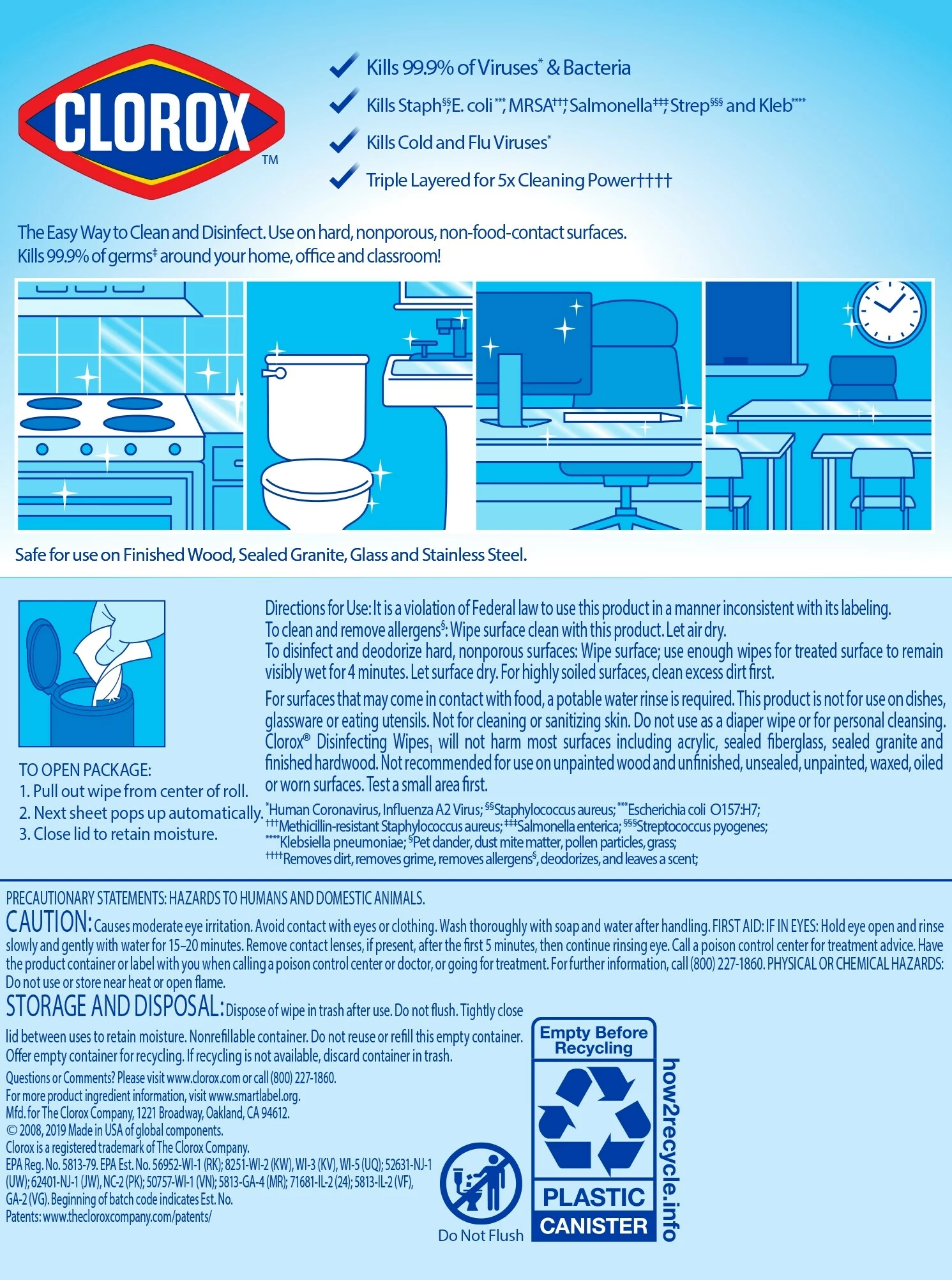 Clorox® Disinfecting Wipes are triple-layered to clean, disinfect, deodorize and remove allergens for 5x Cleaning Power and leave a pleasant scent. Disinfecting Wipes clean and disinfect with antibacterial power that kills 99.9% of viruses and bacteria that can live on surfaces up to 48 hours, including COVID-19 Virus, staph, E. coli, MRSA, salmonella, strep and Kleb. These all-purpose disposable wipes remove common allergens, germs and messes on surfaces like kitchen counters, bathroom surfaces and more and can prevent the growth of bacteria for up to 24 hours. Wipes are safe to use on finished wood, sealed granite and stainless steel. Disinfecting Wipes are also great on non-food-contact surfaces in the home, office, classroom, pet area, dorm and locker room. Clean with bleach-free wipes to keep dirt and germs away. Kills SARS-CoV-2 on hard, nonporous surfaces; odor causing bacteria on non-food contact surfaces