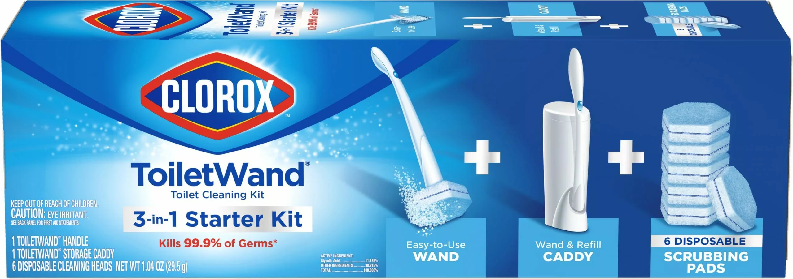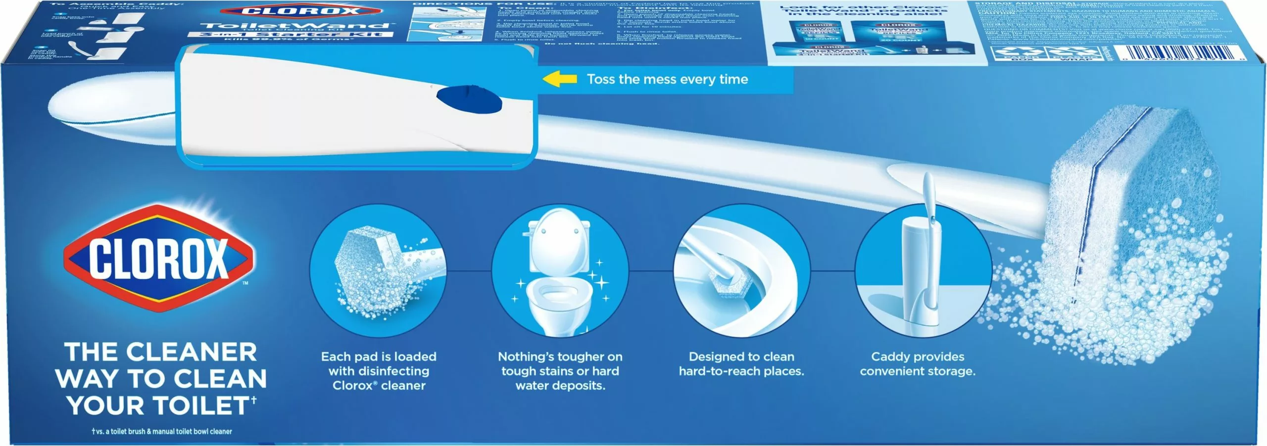 Clorox ToiletWand Disposable Toilet Cleaning System is a convenient way to a quick clean toilet. The starter kit contains one wand, 6 refills and 1 storage caddy to get you started on a deeper clean. Each disposable head is preloaded with Clorox Cleaner with 4x the powerful scrubbing action to clean tough stains, kill germs, remove rust, calcium and limescale while it disinfects and deodorizes with ease. Based on comparative lab tests, the toilet wand cleans better than a brush. The sponge like cleaning head is shaped so that you can get into every nook and cranny needing cleaning and germ control while killing 99.9% of germs like staphylococcus aureus, salmonella enterica, rhinovirus type 37 and influenza A. This all in one system is designed so that you get a brand new cleaning sponge every time you clean without having to touch a yucky brush. Just click your way to a cleaner toilet with the Clorox ToiletWand Disposable Toilet Cleaning Starter Kit.
