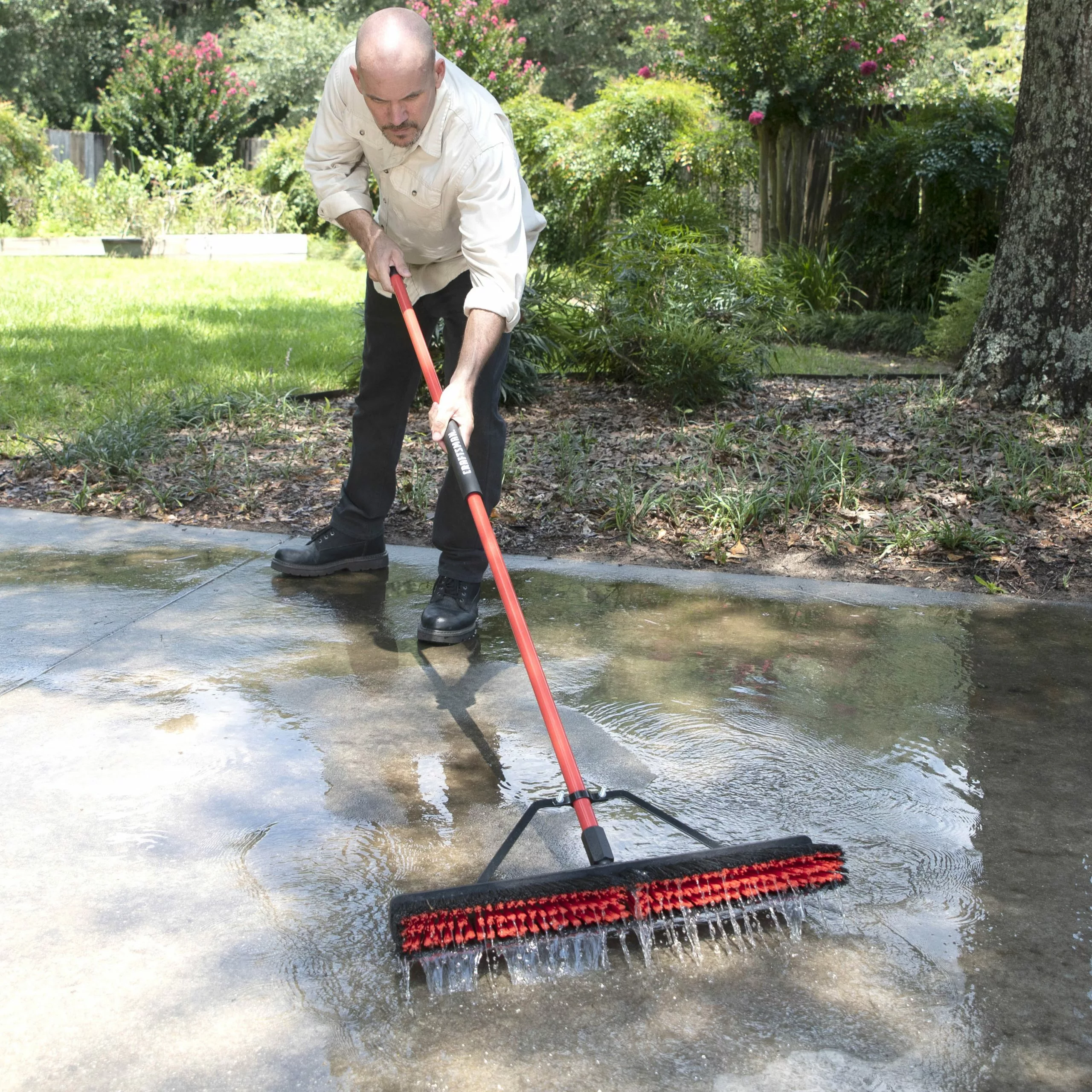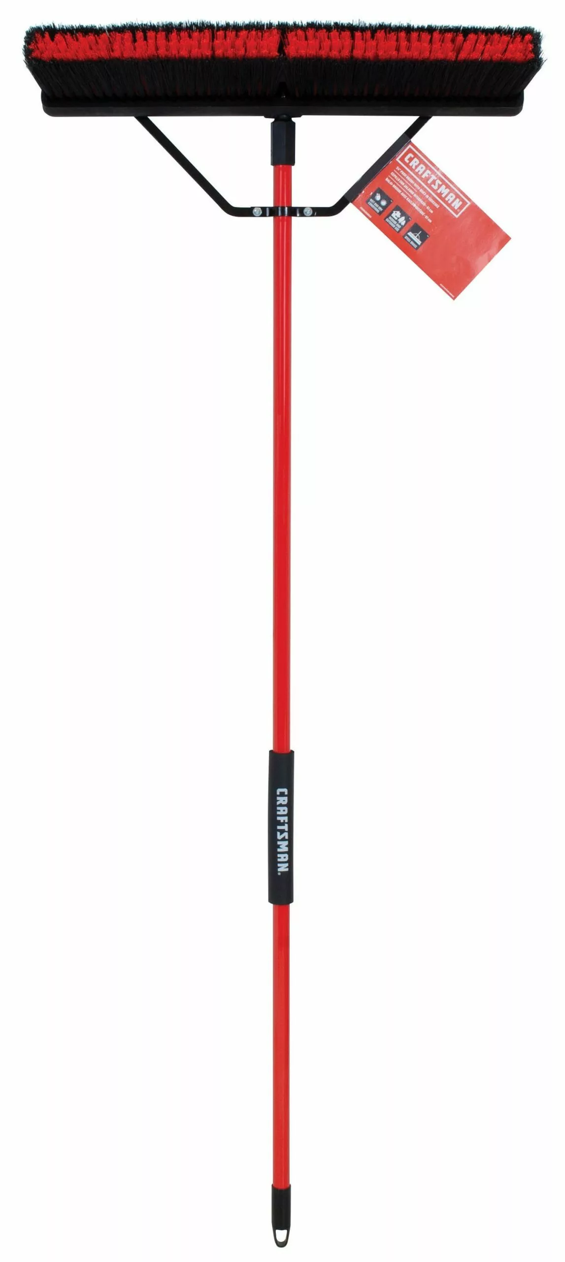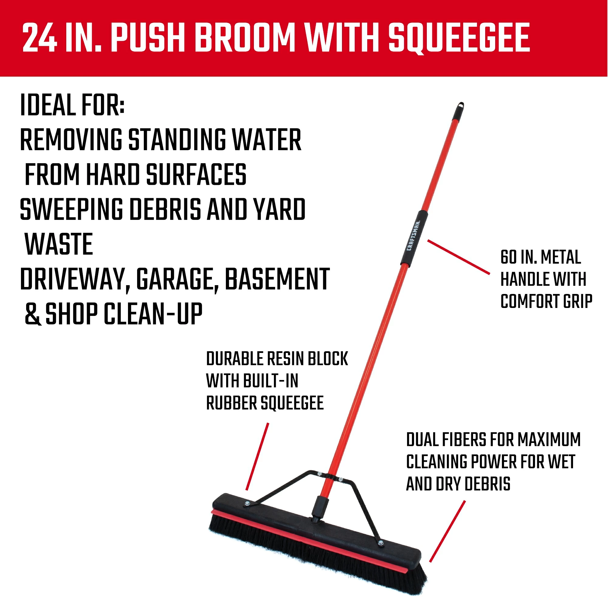 The CRAFTSMAN squeegee push broom is two durable cleaning tools in one! 24 In. wide cleaning surface sweeps away wet and dry debris such as standing water and slush, grass, leaves, dust and dirt. The steel brace reinforces the connection between the brush head and handle so it will not become loose. The comfort grip makes this a cleaning tool that can be used for daily clean-ups.