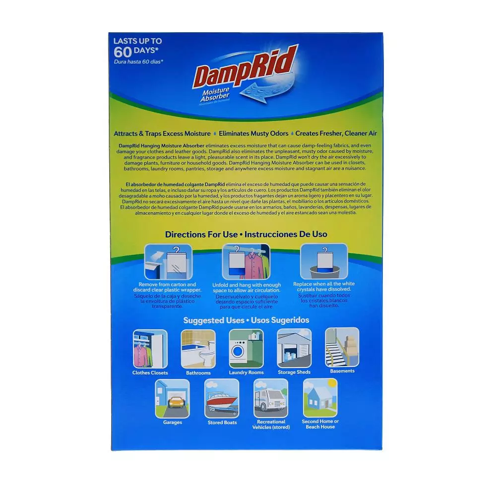 DampRid Hanging Bag Moisture Absorber eliminates excess moisture that causes dampness, musty odors from the air, get rid of stale, musty odors. The hanging bag design is perfect for closets, laundry rooms, and storage areas where clothes often collect unpleasant odors. DampRid crystals absorb excess moisture to create and maintain the optimal humidity level wherever moisture is a problem. Each dehumidifying bag can last up to 60 days depending on the level of humidity and temperature. When the bag is finished, simply discard and replace. Available in a variety of scents or in Fragrance Free. Not for use in moving vehicles. Keep out of reach of children. Read and follow all label directions.