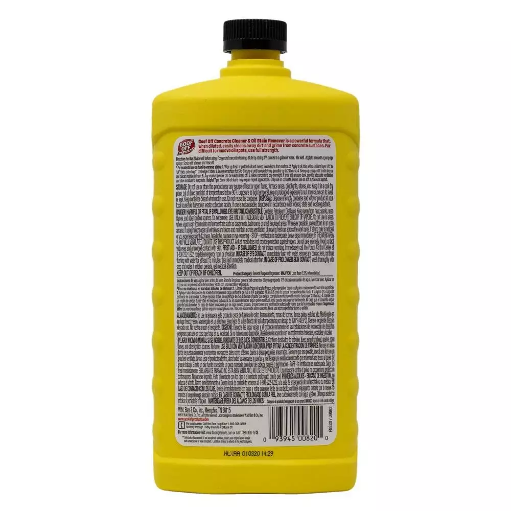 Goof Off Concrete Cleaner and Oil Stain Remover cuts through the toughest concrete grease, oil, and dirt – satisfaction guaranteed. This super clean degreaser has a powerful, concentrated formula to remove the deepest concrete stain and oil. It works the first time by penetrating oil on contact. To use apply a diluted mixture to surface-level stains or pour directly on the area for tougher, deeper stains. Watch the oil dry to a powder and then sweep it up to leave your concrete or driveway cleaner than ever. Keep out of reach of children. Read and follow all label directions