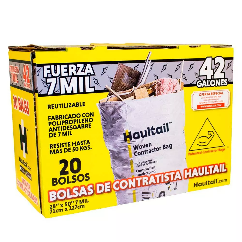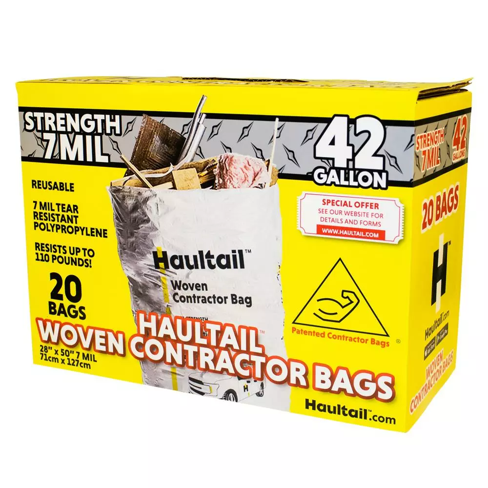 Haultail woven contractor grade bag is heavy-duty, eco-friendly, cost effective, reliable for multi-use and tough projects. 100% eco friendly made of patented reclaimable poly-woven plastic fiber construction. 3X stronger than its nearest competitor and its superior durability makes it the perfect waste removal bag for construction, DIY projects, junk trash or debris cleanup. Over 7mil strength, compared to the 3 mil contractor garbage bag. This contractor bag allows to carry up to ten times the amount of waste that a typical trash bag can hold and is up to about 5X reusable.