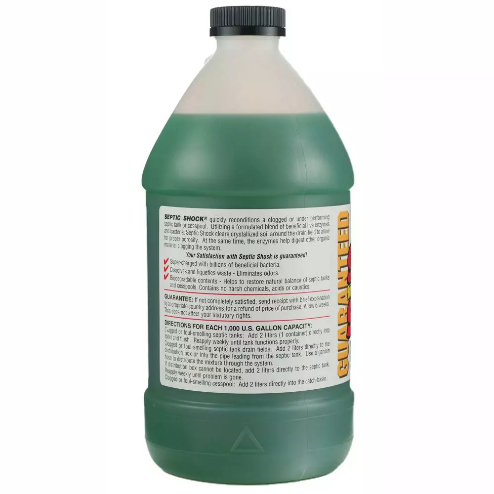 Instant Power Septic Shock® 67.6 FL OZ (2 Liter) quickly reconditions a clogged or under-performing septic tank or cesspool. Utilizing a formulated blend of beneficial enzymes and bacteria, Septic Shock® clears crystallized soil around the drain field to allow for proper porosity. At the same time, bacteria help to digest other organic material clogging the system. Our Septic Shock® is “super-charged” with billions of beneficial bacteria. It dissolves and liquefies waste and eliminates odors. It dissolves paper, grease, soap, protein and starches. Our premium, biodegradable formula, will help to restore the natural balance of septic tanks and cesspools. Septic Shock® contains no harsh chemicals, acids or caustics and is safe on all pipes and septic systems. This product can be used in septic systems and RV’s. Treat as needed or to jump start a new system. Septic Shock® is not intended to clear drains that are completely clogged.