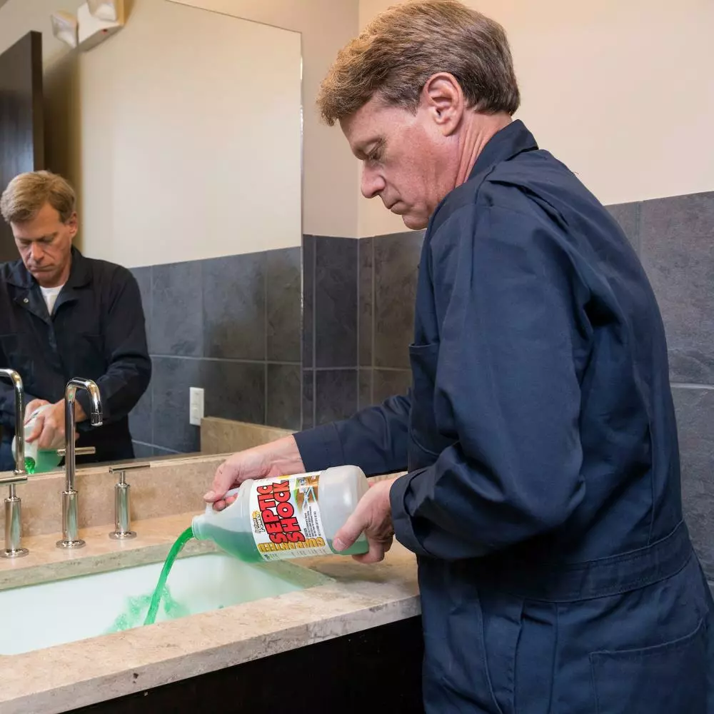 - For clogged or foul-smelling septic tanks, add the entire 67.6 oz (2 liters) directly into the toilet and flush and you should reapply weekly until tank functions properly