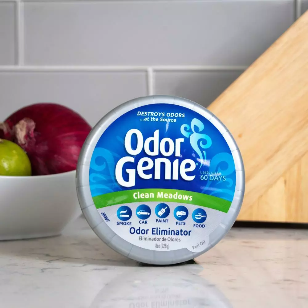 Odor Genie 8-ounce Odor Eliminator is your solution for fresher, odor-free air. Unlike some air fresheners that only mask odors, the unique formula of Odor Genie destroys tough odors. It goes to work immediately after opening the container, neutralizing odors, creating fresher indoor air. Works great as a bathroom deodorizer, pet odor eliminator, or closet deodorizer, where odor is a problem. Easy to use, just remove the top label and place container in problem area. Discard in trash when Odor Genie is 10% of original size. Long-lasting freshness that lasts up to 60 days. Absorbs and eliminates many odors such as tobacco smoke, pet odors, paints/solvents/gasoline, kitchen odors, bathroom odors, trash odors, and musty odors. Best when used in areas approximately 300 square feet. This closet odor eliminator or pet odor absorber is available in Lavender Vanilla, Clean Meadows, and Wild Berry scents. Keep out of reach of children. Read and follow all label directions.