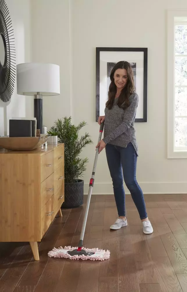 Efficient dust mop pad with long chenille fingers and low pile in the center to quickly trap dust and debris. Innovative, flexible head and handle to easily clean under furniture or along baseboards.
