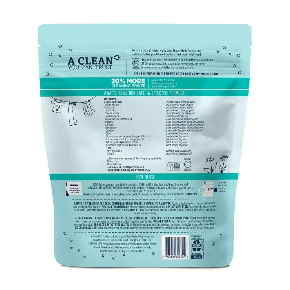 Sometimes you’ve got to pull out the big guns. Seventh Generation Ultra Power Plus Laundry Detergent Packs feature an advanced stain fighting formula with 20% more cleaning power. Fight your toughest stains like coffee, tomato sauce, grass, and ice cream – all without the use of synthetic fragrances, dyes, or artificial brighteners. This laundry soap uses plant-derived enzyme stain removers like Protease and Amylase to tackle the mess while whitening and anti-graying enzymes help brighten. We like to keep it real when it comes to scents, too. Our Fresh Citrus Laundry Detergent is scented with 100% essential oils and botanical ingredients like orange peel, grapefruit peel, and lavender. Our new tub packaging is fully recyclable and designed with storage and freshness in mind – the shape fits neatly in tight spaces, and the flip top closure keeps packs fresh and out of reach from your little ones. These easy-to-use laundry packs are wrapped in a dissolvable PVA film – just toss one into your high-efficiency (HE) or standard washing machine and let our plant-based ingredients work their wonder. For more than 25 years, Seventh Generation has been thoughtfully formulating safe and effective plant-based products that work. Really well. As a leading green laundry detergent manufacturer, we are proud to offer the first powdered laundry packs that are EPA Safer Choice Certified. You may also notice a cute Leaping Bunny seal on our products. That means we never test our products on animals and our products do not contain animal-based ingredients. We design our products to be safe for people, their homes, and the environment. Based in Vermont, Seventh Generation is proud to be a Certified B Corporation. By choosing Seventh Generation products, you’re joining us in nurturing the health of the next seven generations. Compared to the amount of cleaning enzymes in our laundry detergent packs.HE Laundry Detergent.