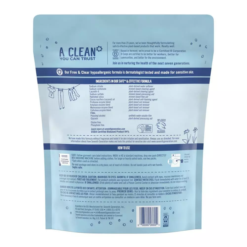 Tough on stains, gentle on skin. Seventh Generation Free and Clear Laundry Detergent Packs feature a powerful quadruple-enzyme formula that fights tough stains without the use of fragrances, dyes, and artificial brighteners. Plant-derived enzyme stain removers like Protease and Amylase tackle the mess while whitening and anti-graying enzymes help keep clothes bright. Grass stains, ketchup, or chocolate – you name it, we’ve got you covered. This hypoallergenic and fragrance free laundry detergent is dermatologist tested to be gentle on sensitive skin. Our easy-to-use laundry packs are wrapped in a dissolvable PVA film – just toss one into your high-efficiency (HE) or standard washing machine and let our plant-based ingredients work their wonder. For more than 25 years, Seventh Generation has been thoughtfully formulating safe and effective plant-based products that work. Really well. As a leading green laundry detergent manufacturer, we are proud to offer the first powdered laundry packs that are EPA Safer Choice Certified. You may also notice a cute Leaping Bunny seal on our products. That means we never test our products on animals and our products do not contain animal-based ingredients. We design our products to be safe for people, their homes, and the environment. Based in Vermont, Seventh Generation is proud to be a Certified B Corporation. B Corps are certified to be better for workers, better for communities, and better for the environment. By choosing Seventh Generation products, you’re joining us in nurturing the health of the next seven generations.