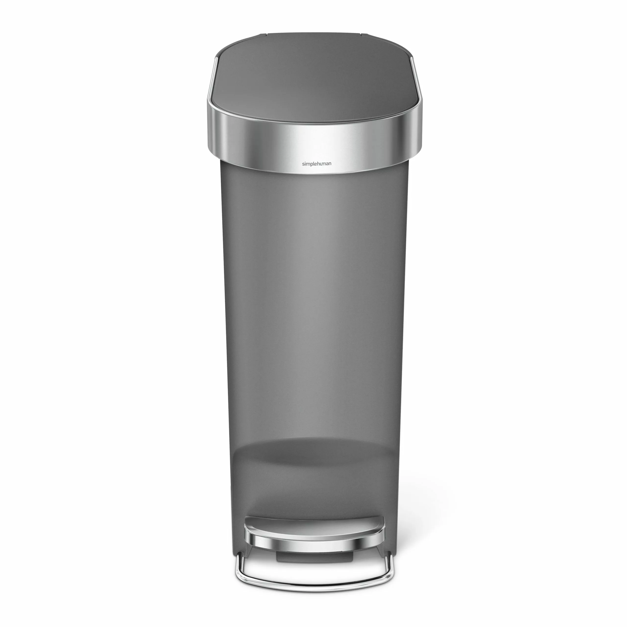 The simplehuman slim step can has a space-efficient shape that fits perfectly in tight spots, like between cabinets. The stainless steel liner rim lifts up for easy access to the liner, then closes to grip and keep it neatly out of sight. The strong steel pedal is built to last, and lid shox® technology ensures a smooth, silent close every time.