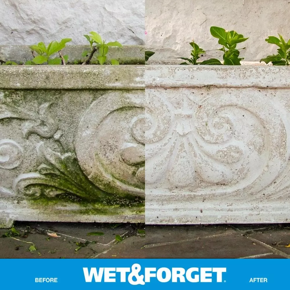 Effectively clean up moss, mold, mildew and algae without any scrubbing. Simply spray Wet and Forget Ready-To-Use on, and forget it. Wet and Forget Ready-To-Use comes premixed with an easy-to-use trigger sprayer to treat virtually any small outdoor surface. The attached sprayer reaches up to 10 Ft. high, providing better and faster coverage at any angle. One bottle will cover 60-180 square feet, depending on the porosity and severity of the staining. The premixed formula is bleach free, phosphate free. Wet and Forget Ready-To-Use is perfect to use to treat small surfaces such as umbrellas, planters, statues and porch steps.