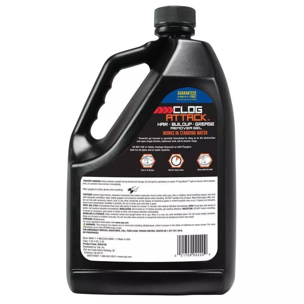 Zep clog attack is a powerful, thick, fast-acting, drain opener that pours through standing water to attack many types of clogs. It is safe for pipes and septic systems.